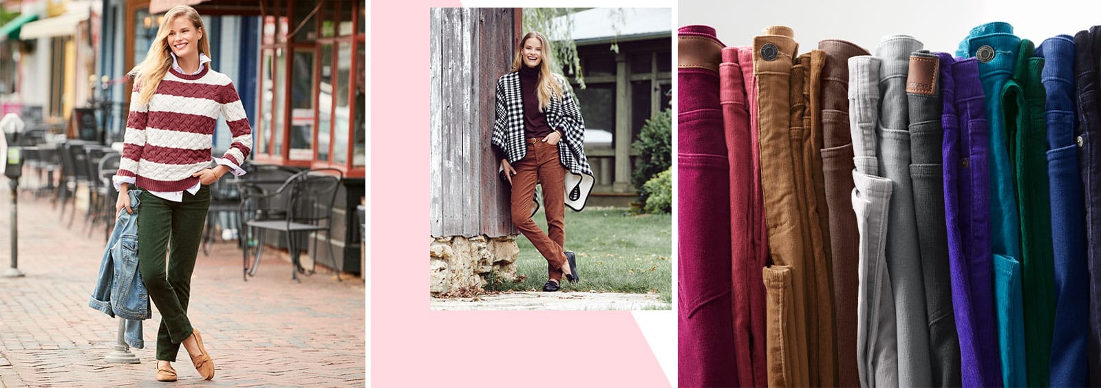 Farbe ist auch wichtig, wenn es um die Jahreszeit geht. Obwohl Cordhosen eher ein Klassiker für kaltes Wetter sind, können Sie mit dem richtigen Paar auch an warmen Tagen durchkommen. Etwas in Rotkehlchen-Blau, Flieder-Lila oder Baby-Rosa wird Ihre Frühlingsgarderobe aufpeppen und dieselben Farbtöne können auch sommerfreundlich sein. Ein verkürzter Schnitt ist auch gut für schöne Tage und sieht süß mit Mules, Flats und Sandalen aus.