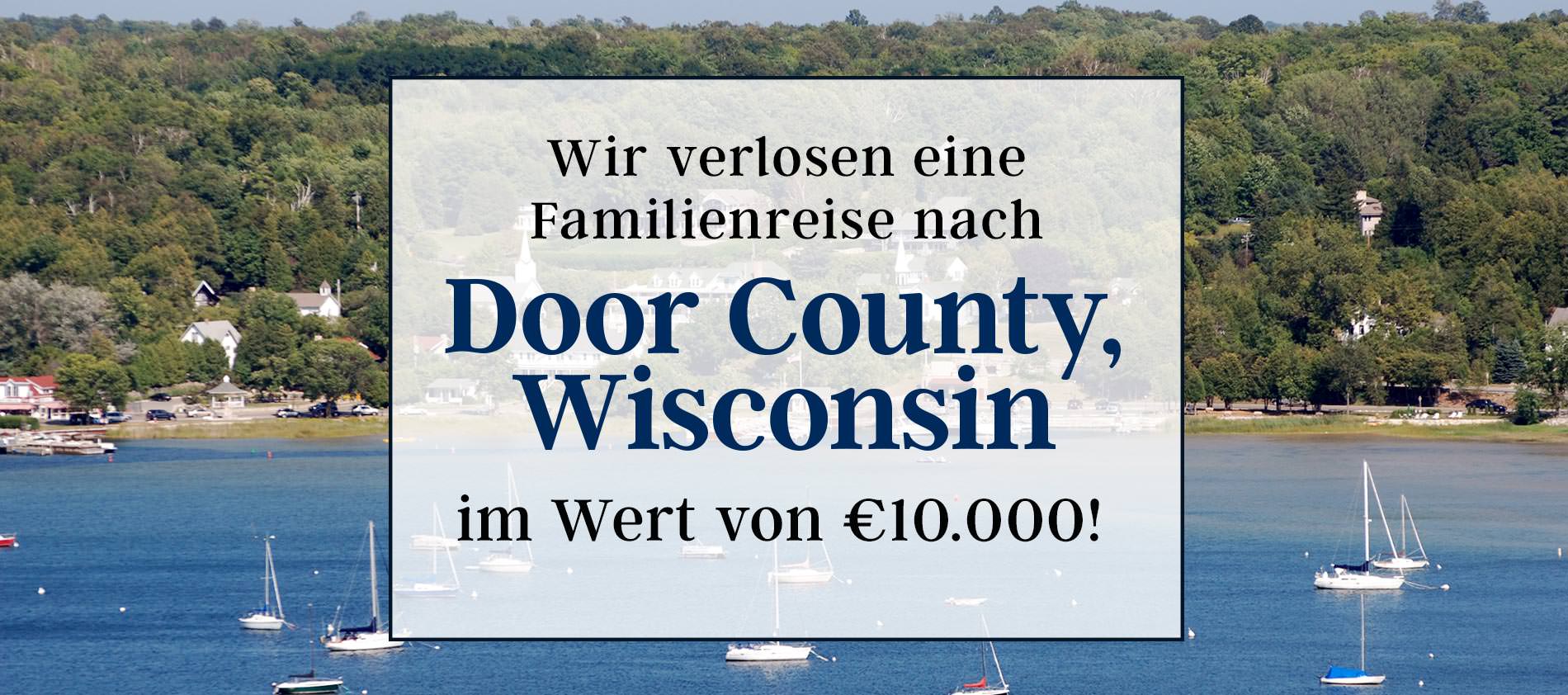 In Zusammenarbeit mit dem Door County Visitor Bureau bekommt eine 4-köpfige Familie die Chance, Wisconsin, den Heimatstaat von Lands’ End, kennenzulernen. Door County befindet sich auf einer Halbinsel am Lake Michigan. Hübsche kleine Städte, Naturparks und vorgelagerte idyllische Inseln prägen die Landschaft. Der fantastische Preis der Verlosung beinhaltet: